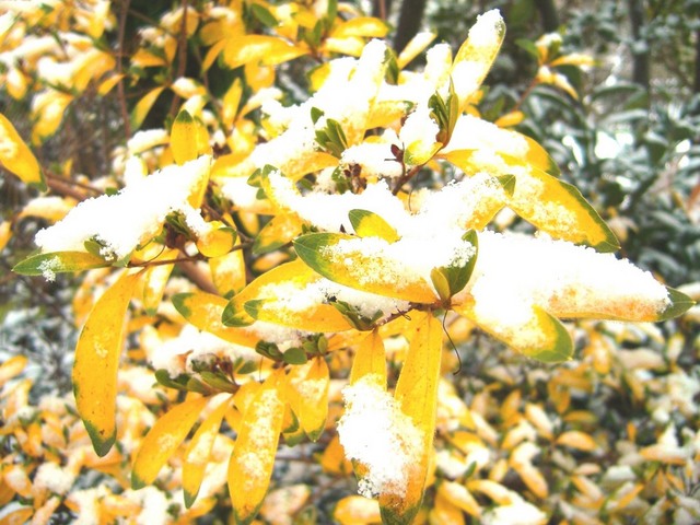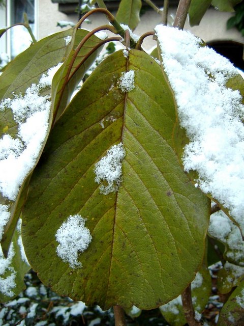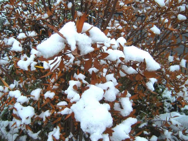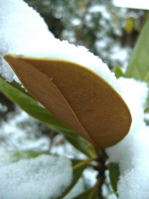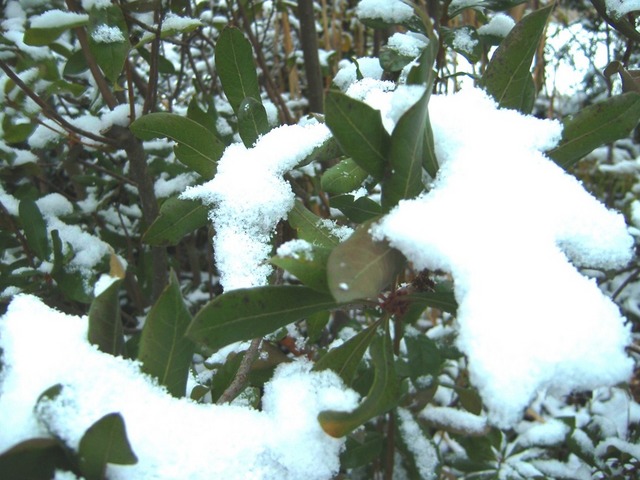 Hat bisher leider noch nicht geblüht, die hübschen Blätter sind eigentlich ziemlich tough und bleiben für ein sommergrüne Magnolie lange – bis Mitte November – grün am Baum, vertragen sogar leichten Frost. Was sie gar nicht verträgt ist sommerliche Hitze, bei Temperaturen über 30 ° ‚Verbrennen’ die Blätter und sehen so aus, als hätte eine Waldbrand gewütet, vor allem der Neuaustrieb leidet stark – daher an der Küste sicher besser aufgehoben. Hier das noch ziemlich grüne Laub schneebedeckt.