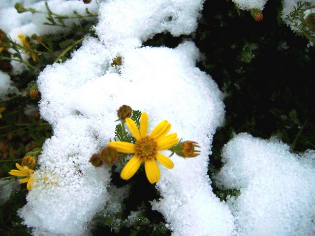 Dieses im Herbst blühende südafrikanische strauchige Kreuzkraut hatte ich weiter unten vorgestellt. Wenn der Himmel schon Einheitsgrau ist, dann scheint wenigstens 'ne Mini-Sonne aus dem Schnee hervor!