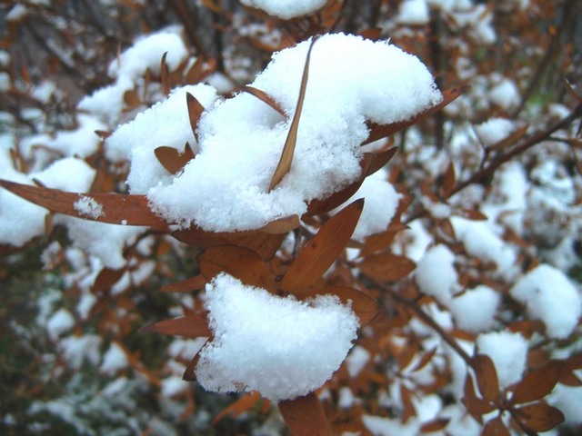 /*Embothrium coccineum J.R. Forst. & G. Forst ‚Cerro Lopez’*/ Notro - Das Laub verfärbt sich vorm Fall nach dunkelbraun, auch ein schöner Kontrast zum weißen Schnee, das letzte Foto noch kurz vorm ersten Schneefall