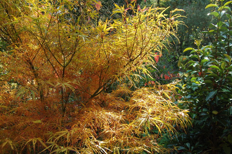 /*Acer palmatum Red Pygmy*/ entwickelt sich immer mehr zu einem "gestandenen" Baum. Re daneben mit glänzenden, lackartigen Blättern: Viburnum odoratissimum Awabuki