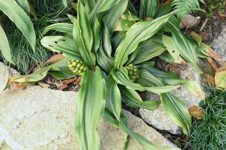 Ein paar Tage später werden sich die Fruchtkolben von Rohdea japonica Suncrest korallenrot färben