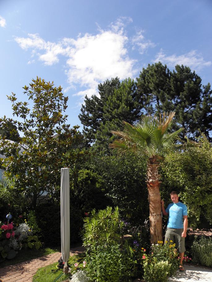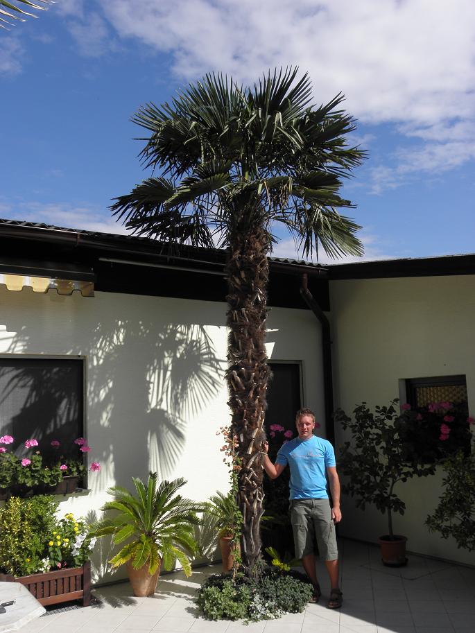 /* Washingtonia robusta */ - man sieht die tiefen Narben im Stamm, die die #&%§*! Viecher hinterlassen haben. Seither ist die Pflanze deutlich geschwächt und die Krone wächst nicht mehr annähernd so schnell wie in den ersten 8-9 Jahren. Sie ist seit Februar 1997 frei ausgepflanzt: