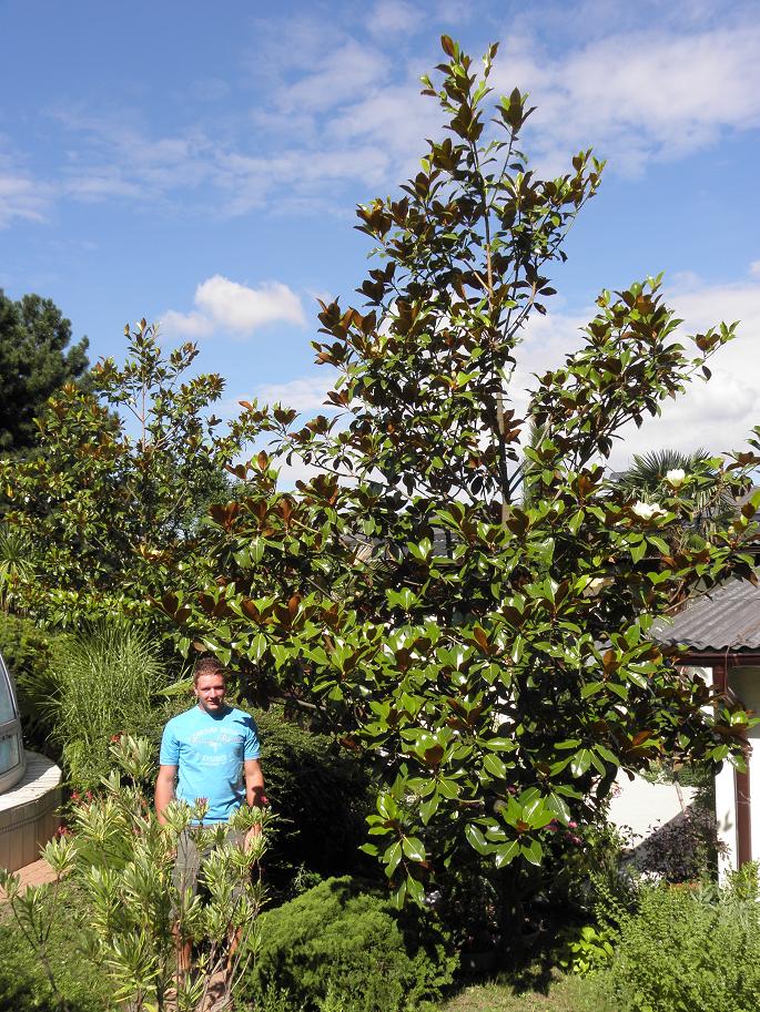 Peter bei meinen zwei größten /* Magnolia grandiflora */: