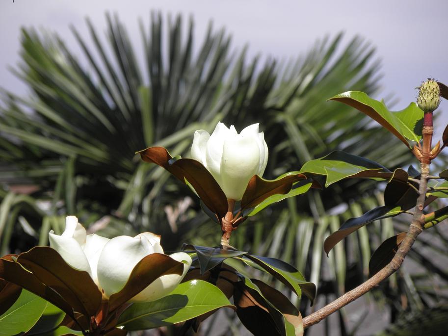 Die zwei großen /* Magnolia grandiflora */ blühen auch immer recht lange: