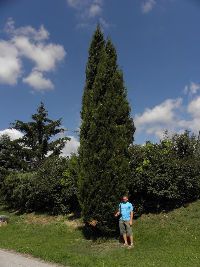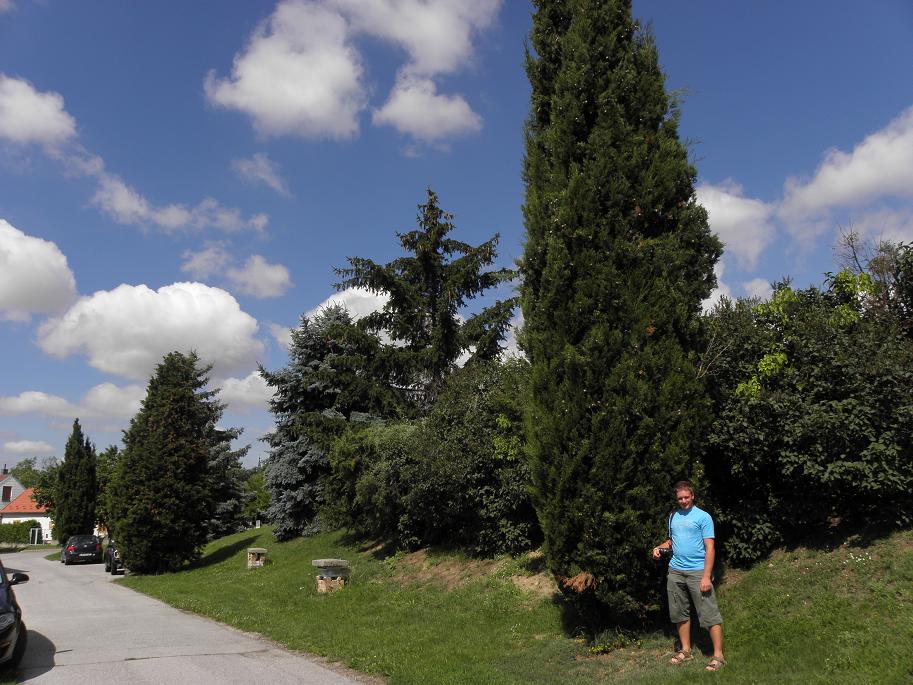 Und hier die großen /* Cupressus sempervirens */. Diese wurden vermutlich (weil eine geschnittene "Horizontalis" auch dabei ist) aus Samen gezogen und vor einer kleinen Ewigkeit dort gepflanzt. Der Stammdurchmesser beträgt bei diesen Exemplaren bereits gute 40 cm. Leider kann man an die Stämme schlecht mit dem Fotoapparat ran und daher bringt man es auf den Bildern nur schlecht rüber. Ursprünglich standen insgesamt 7 große Zypressen dort, jetzt sind es nur noch 4 Stück (eine steht abseits in einem Garten). Die absolut schönsten 3 Stück wurden leider wegen eines Marterls vor einigen Jahren gefällt hat mit Karl/Carnuntum vor einigen Jahren berichtet, der die Zypressen entdeckt hat.