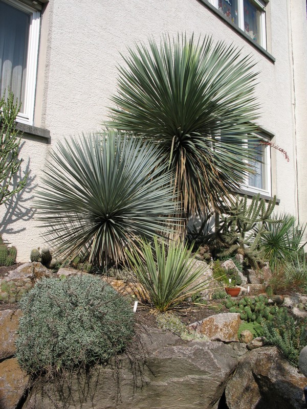 Im Vordergrund Yucca angustissima ssp. avia - von der Lutz vor kurzer Zeit berichtet hatte - und dahinter 2 Y. rostrata, die hinter mit 2 m Gesamthöhe. Der blaue "Igel" im Vordergrund ist ein recht flott wachsender Acantholimon aus der Türkei.