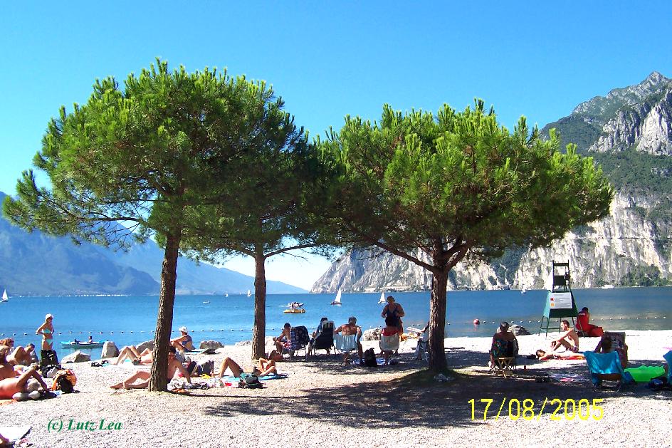 Drei ca. 15 Jahre alte Mittelmeer-Pinien 'Pinus pinea' am Badestrand (Kies) beim Surferrevier in 'Riva'.