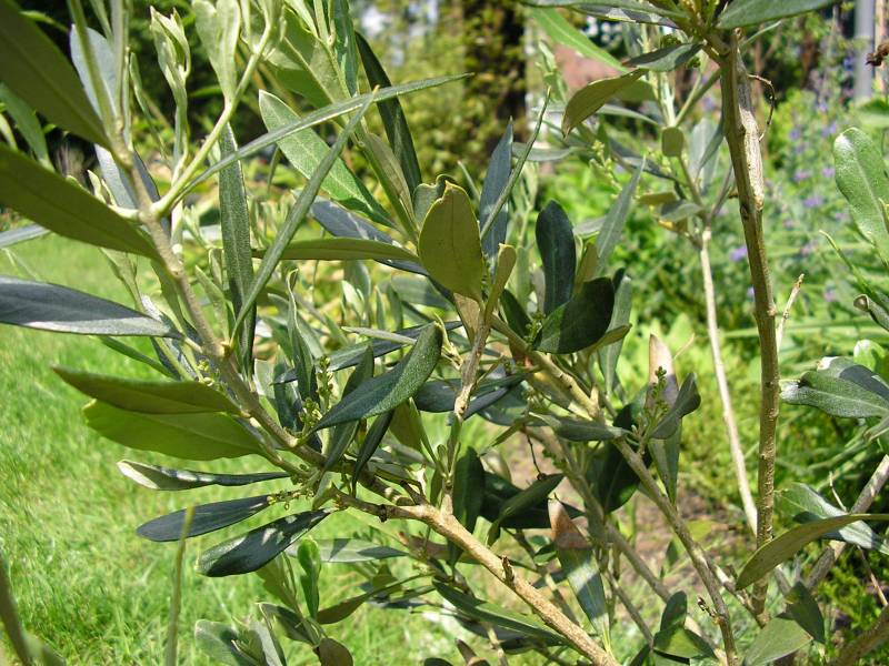 meine kleine Olive, letzten Sommer ausgepflanzt und ohne Schutz schadlos durch den "Winter" gekommen, setzt gerade reichlich Blütenstände an.