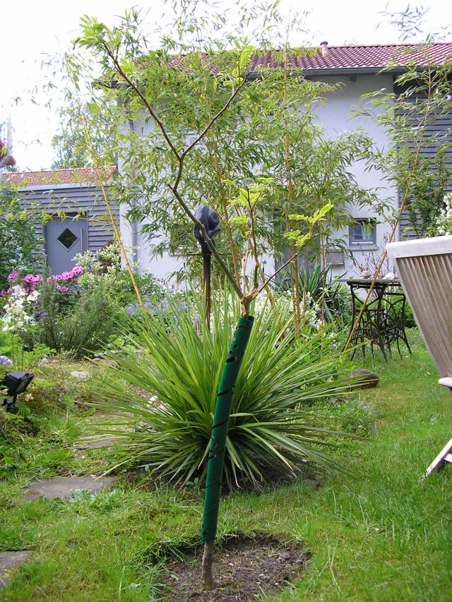 Aufgereiht sind hier Albizia julibrissin im Blattaustrieb ( der etwas häßliche Stammschutz war nötig, weil die Katzen diesen als Kratzbaum erkoren hatten). Dann die jetzt kräftig wachsende Cordyline australis und im Hintergrund das noch schlafende "Monster"- Phyllostachys vivax Aureocaulis.