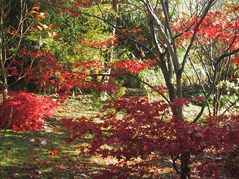 Leider schon etwas entblättert: /*Acer palmatum Atropurpureum*/ neben Acer p. Orangeola u. div. Bambussen
