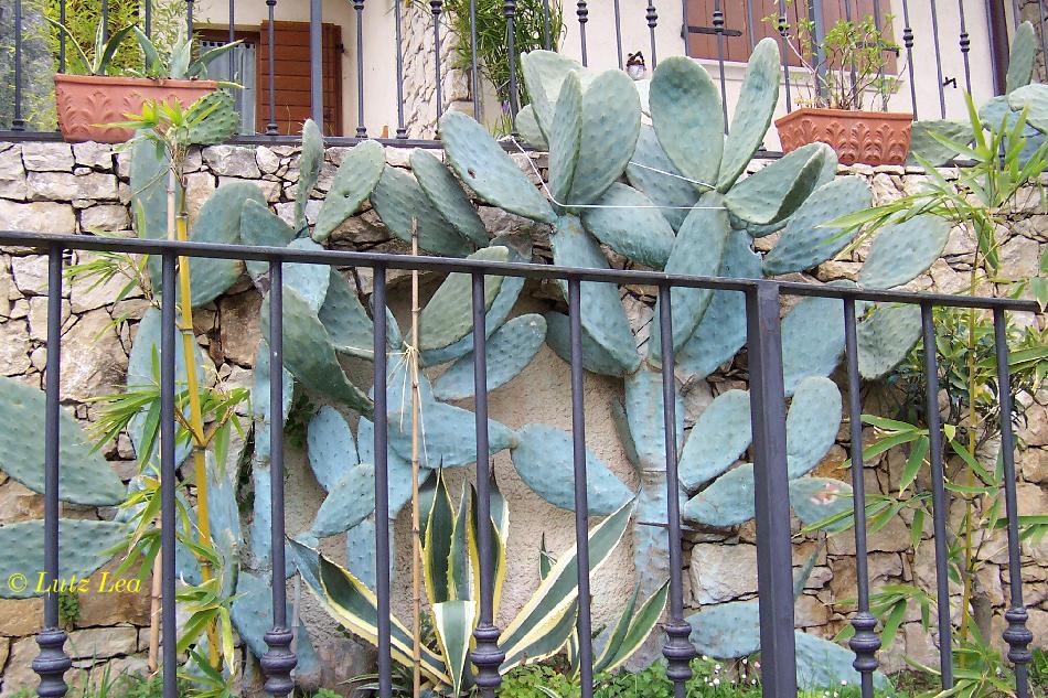 Blauschimmernde Opuntien im Wohnviertel von 'Limone'.