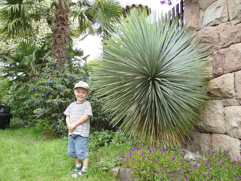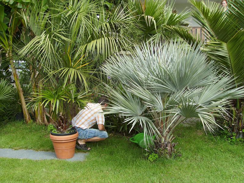 Der Papa ist natürlich ebenso von diesen (fast) Hochlandexoten begeistert. Hier verstecke ich mich zwischen Basjoo, Butia, Brahea und rechts Jubaea: