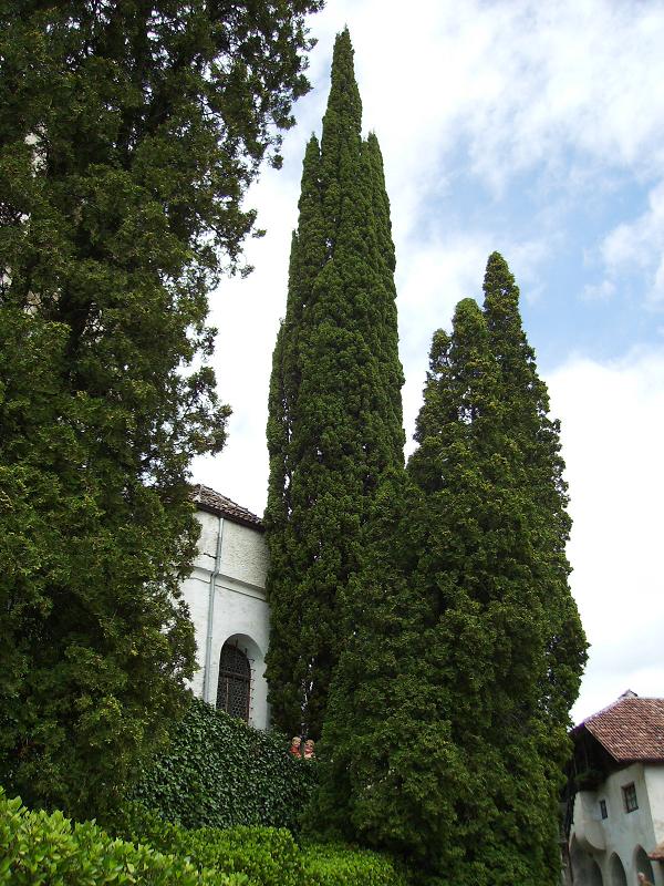 Diese Zypresse bei der Burg Lebenberg, oberhalb von Lana muß wohl schon uralt sein, ich schätze sie auf gut 30m Höhe. Meine Frau+Sohn wirken sehr klein davor, der Stamm war wirklich gewaltig: