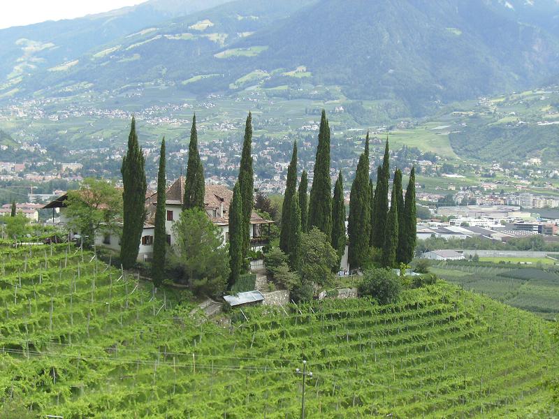Auch dieses Landhaus bei Lana, von zahlreichen Zypressen umsäumt, könnte ohneweiteres in der Toskana stehen. Auch Pinie und Olive fehlt nicht im Garten. Dahinter sieht man Meran und den Eingang ins Passeiertal: