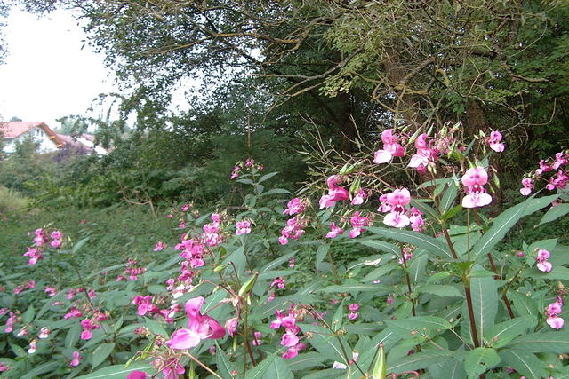 Nahaufnahme des indischen Springkrautes.Im Hintergrund in der Mitte sieht man die Spitze eines Bergmammutbaumes,der sich schon seit ein paar Jahren erfolgreich gegen Gestrüpp und Brennnesseln durchsetzt.