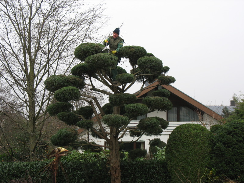 Dieser Garten wurde wie in den 1970ern üblich ursprünglich überwiegend mit Koniferen bepflanzt, welche nach und nach übers Dach wuchsen und zum Teil aufwendig entfernt werden mußten. Dieser Wacholder Juniperus virginiana 'Glauca' sollte eigentlich später auch weg, dann zum Teil als Klettergerüst für eine Clematis im unteren Teil erhalten bleiben. Ich hatte da so meinen eigenen, etwas "schlitzäugigen", Vorstellungen und hatte zunächst etwas eigenmächtig gehandelt. Heute ist der Gartenbesitzer richtig stolz auf das Teil und investiert jährlich gern in meine Schnippelstunden