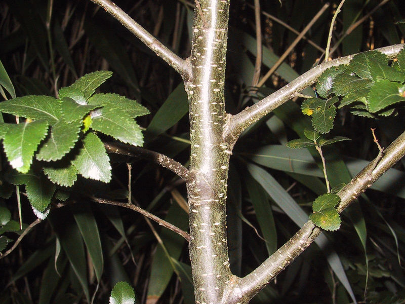 Auch die dunkle Rinde der immergrünen /*Nothofagus dombeyi*/ aus Südamerika sieht dekorativ aus (Baum mittlerweile ca 3m hoch)