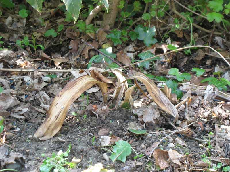 Trauerspiel: Aspidistra lurida 'Ginga', als A. 'Milky Way' im Zimmerpflanzenhandel, nach dem ersten Winter etwas exponiert. Aber noch mit Leben in der Basis.