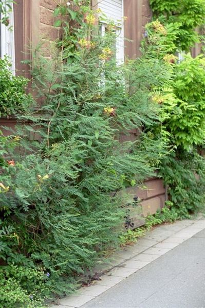 In der Bildanlage eine seit Jahren ausgepflanzte Caesalpinia unmittelbar an einer Hauswand (Foto von Norbert/Rheinstetten)