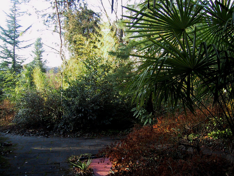 Ein Sonnenstrahl fiel auf den kleinen Lot.-Teich und brachte /*Azolla filiculoides*/ purpurfarben zum Leuchten. Hinten li Cedrus deodara, re Trachy