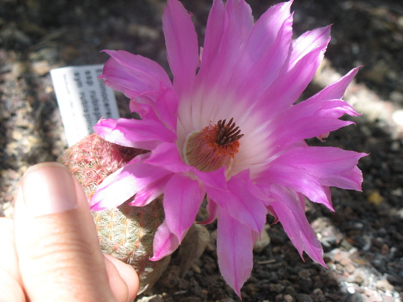 Echinocereus rigidissimus überraschte mit einer Riesenblüte. Im letzten Jahr hatte ich den "Regenbogenkaktus" unter meine große Yucca rostrata ausgepflanzt und dann eigentlich vergessen. Winterschutz? Keiner!!