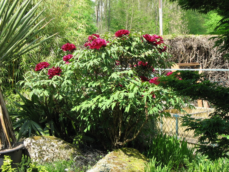 eine eher kompakt wachsene weinrote Sorte, trotzdem nach ca. 15 Jahren mehr als mannshoch. Zum Fotografieren sollte man besser einen Helicopter haben.