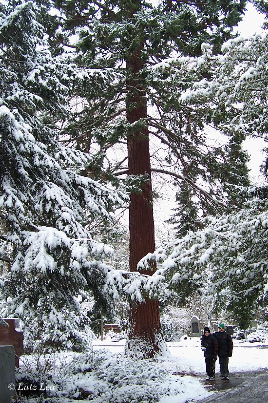 heute in der Winterlandschaft auf dem Südfriedhof in Frankfurt am Main (Sachsenhäuser Berg) fotografiert und vermessen, einen 27 m hohen Berg-Mammutbaum: