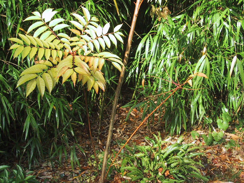 Ähnlich Acer palmatum imponiert auch /*Toona sinensis*/ zweimal im Jahr: im Frühjahr durch ihren lachsfarbenen Austrieb und im Herbst mit leuchtender Gelbfärbung