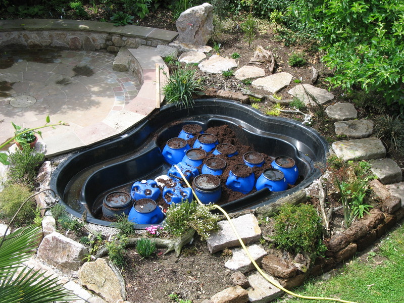 Letzten Samstag 16 Uhr gings los und ich konnte sogar meinen dem pupertären Müßiggang verfallenen Junior aktivieren: Pumpe geholt und den vom Regen vollen Teich abgepumpt, dabei davon gut 600 Liter Regenwasser in div. Wannen zur Wiederverwendung gesichert. Irre Sedimente entfernt - wie kam nur der "Flachmann" da rein ??? All die teuren Fässer mit der Bohrmaschine durchlöchert. Immerhin fasst das Reservoir nun knapp über 1000 Liter. Bis zur totalen Dunkelheit waren bereits die ersten Torfballen drin und ein kleiner Teil des Wasser zurückgepumpt. Das Hauptproblem war am Anfang das Sichern gegen Aufschwimmen.