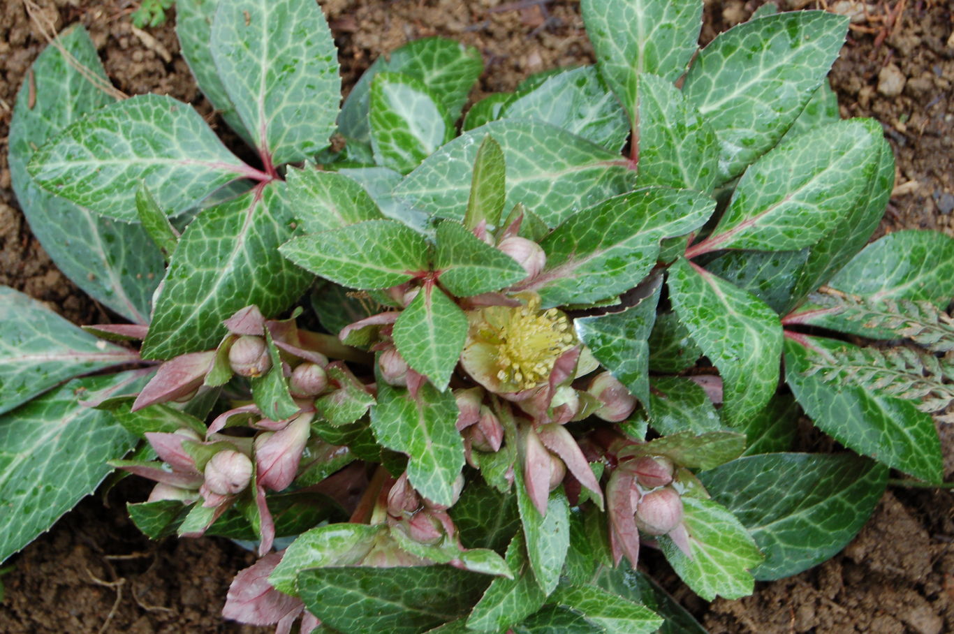 Diese Hybride zeichnet sich durch wunderschöne, marmorierte Blätter aus (/*Helleborus Hybride*/)#AM