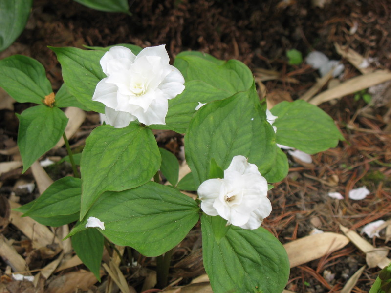 /*Trillium grandiflorum 'Plenum'*/, erst auf der Raritätenbörse im Palmengarten für 120 € angeboten gesehen. Da ist man richtig froh, dass diese Pflanze längst im Garten wächst und man nicht auf abwegig teure Gedanken kommt