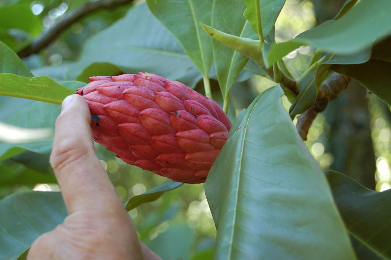 von /*Magnolia tripetala*/ sind auch im August eine Zier (allerdings waren sie in den letzten Jahren nicht so dick und schwer wie heuer!)