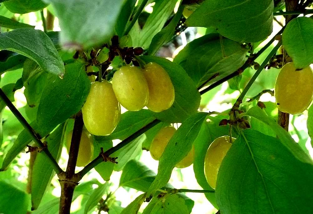 ..und hier eine gelbfrüchtige Kornelkirsche (/*Cornus mas ‘Flava’*/ = C. mas ‚Xanthocarpa’). Die 2,5-3 cm langen Früchte schmecken säuerlich-aromatisch. Sie sind so groß wie die der rotfrüchtigen Obstsorte ‚Jolico’, haben aber den Vorteil, dass die Amseln vergeblich darauf warten, dass sie rot werden...