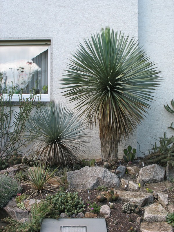 und das gleiche Motiv noch einmal ganz frontal. Die rechte Pflanze ist jetzt gerade einmal 220 cm hoch, wirkt aber durch den erhöhten Standort wesentlich größer. Die Breite der Krone ist im Vergleich zum Zeitpunkt der Pflanzung richtig gewaltig geworden.