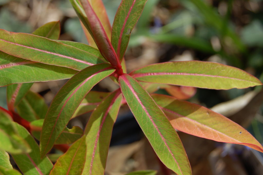 /*Euphorbia griffithii-Selektion*/ mit auffallend rötlich gefärbten Blattmittelstreifen