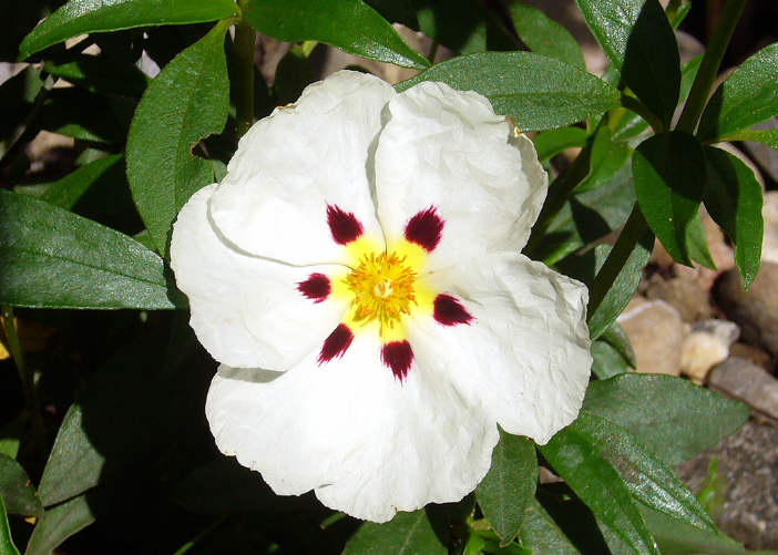 jetzt blueht gerade /*Cistus x cyprinus*/ in der Sorte *A Grandes Macules*. Diese hat riesige (8 cm breite) Blueten mit dunklelvioletten und gelben Basalflecken. Ein typischer Hingucker.