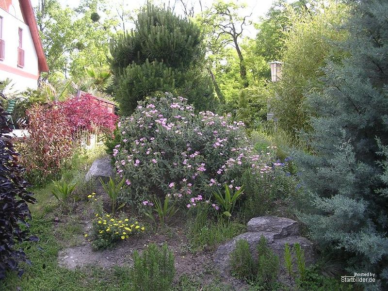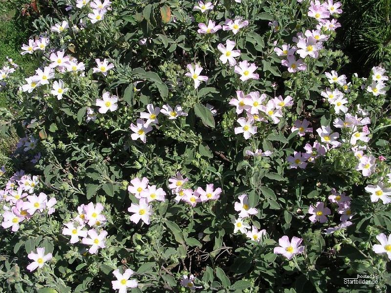 Meine Cistus habe ich als ganz kleines Pflänzchen vor 5 Jahren bekommen. Sie breitet sich seither enorm aus, hat ca. 80- 100 cm Höhe und weit mehr als 1 Durchmesser erreicht. Michael Lorek hat mir schon mal mögliche Alternativen genannt, welche Pflanze das sein könnte. Auf jeden Fall stammt diese Pflanze aus Kreta, könnte also Cistus creticus oder eine Cistus creticus-Kreuzung sein. Cistus creticus soll ja eher frostempfindlich sein. Diese Pflanze hier packt aber unsere Winter hier ohne jeglichen Schutz anstandlos nur mit ganz leichten braunen Blattspitzen in kalten Wintern.