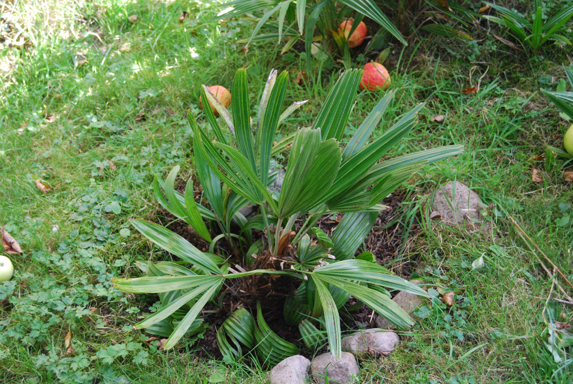 Sie muß halt nur aufpassen, daß sie nicht von den aus fünf Meter Höhe hinabstürzenden Äpfeln erschlagen wird - aber mein Rhapidophyllum ist ja hart im Nehmen.