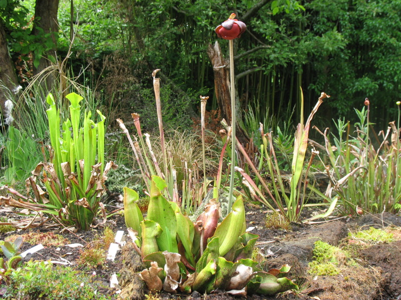 die selbst so niedrig und kompakte Sarracenia purpurea schiebt ihren Blütenstand mächtig weit empor
