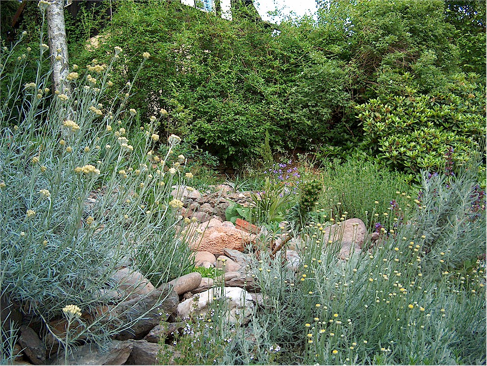 In einem langwierigen Prozeß habe ich versucht den Garten mit harmonischen, mediterranen Grundstruckturen auszustatten. Hierbei stand die Geländemodellierung an erster Stelle. Ich habe hauptsächlich die reichlich vorhandenen Natursteine dabei benutzt. Dies steht im Konflikt mit der strengen, konservativen und totalitären Gartengestaltung meiner Eltern, die hauptsächlich auf Betonsteine, Fichten und gerade Linien setzten. Dieses Konzept habe ich unterhöhlt und soweit ich konnte durch angenehmere Strukturen ersetzt, ohne das dabei die Praktikabilität des Gartens verloren ging.