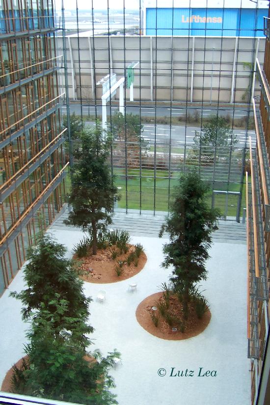Die verglasten Gärten fördern nicht nur ein gesundes Mikroklima im gemäßigten Gebäude, sie bilden funktional auch einen effektiven Kälte-, Wärme- und Lärmpuffer." (Zitat aus dem neuesten Faltprospekt/Broschüre der Lufthansa/Aviation Center).
