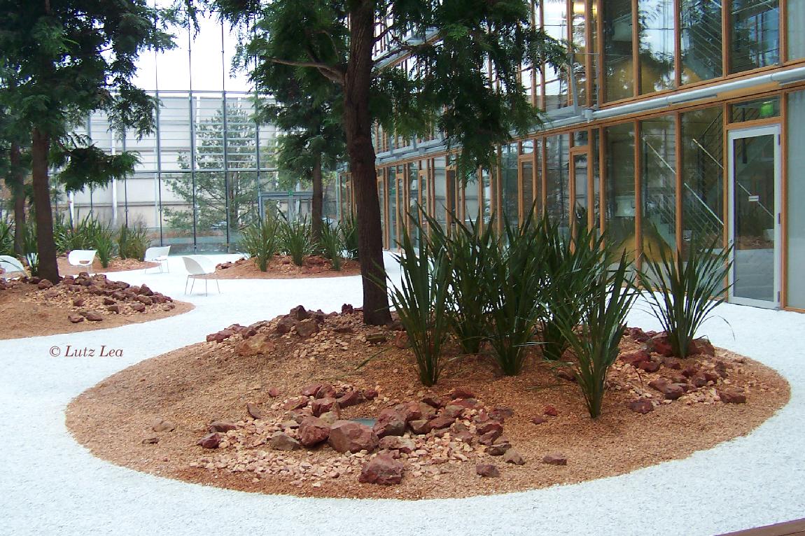 "Insgesamt zehn an unterschiedlichen Klimazonen ausgerichtete Gärten tragen bei zum unverwecheselbaren Charakter des Gebäudes. Die repräsentativen Vegetationen gemäßigter Klimazonen spannen das Spektrum über alle fünf Kontinente und reichen vom California Beach bis hin zum japanischen Tempelgarten.