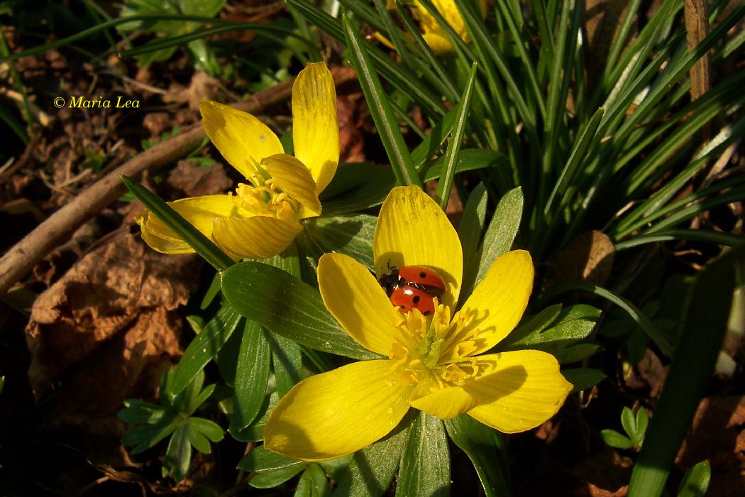 Sogar ein Marienkäfer war zum Vorschein gekommen - hier sonnend auf Blüte des Winterlings!
