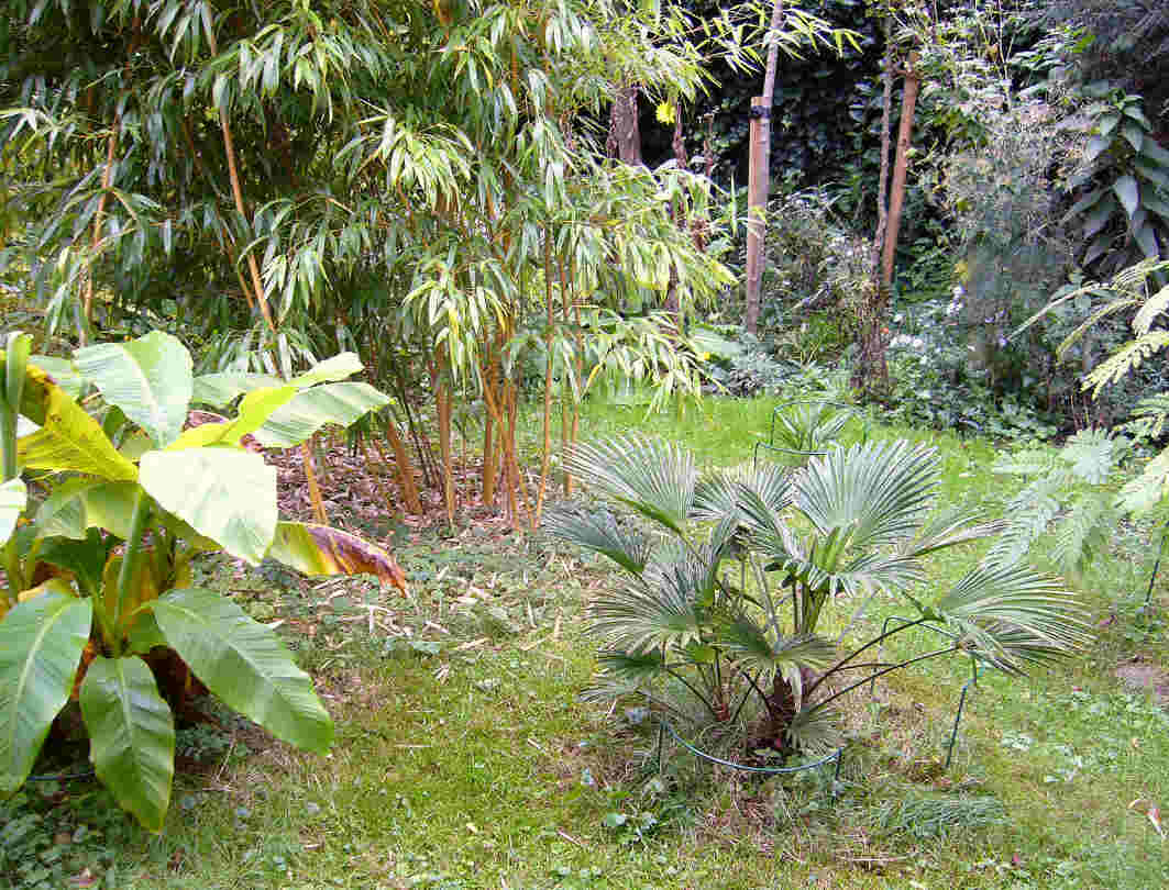 ..und hier ein Ausschnitt aus dem Blick nach W (das Ganze waere zu unuebersichtlich). Hier sieht man von li nach re: /*Musa basjoo*/-Kindel, /*Phyllostachys vivax *Aureocaulis**/, /*Trachycarpus wagnerianus*/ (am Grunde verweigt und daher 2-staemmig), rechts ragt noch Albizia julibrissin *Rosea* ins Bild.