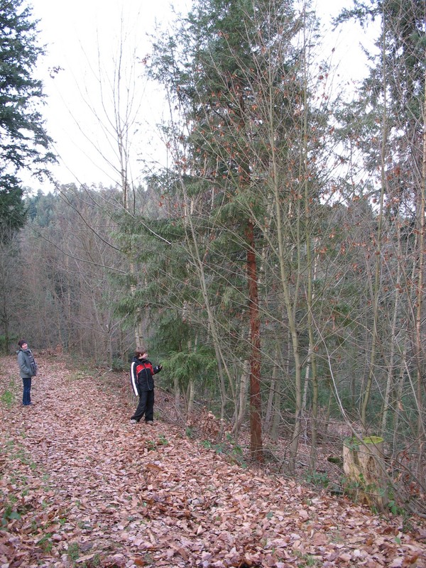 kaum einmal einen anderen Weg als sonst genommen, stießen bald auf diesen jugendlichen Redwood Sequoia sempervirens, ein Stück weiter kam eine ganze Schonung Sequoiadendron giganteum erst wenige Meter hoch. Eindrucksvoll auch die vielen - heimischen - Ilex aquifolium, mannsstark und weit über 10 m hoch. Knorrige Eiben und alles was man sich an Koniferen im Forst vorstellen kann auf kleinsten Raum. Laubbäume - jetzt natürlich eher unauffällig - auch das ganze Spektrum an einheimischen und eingebürgerten Waldbäumen und immer wieder mal ein unerwarteter Exot dazwischen. Das ist "Mischwald" im warsten Sinne des Wortes.