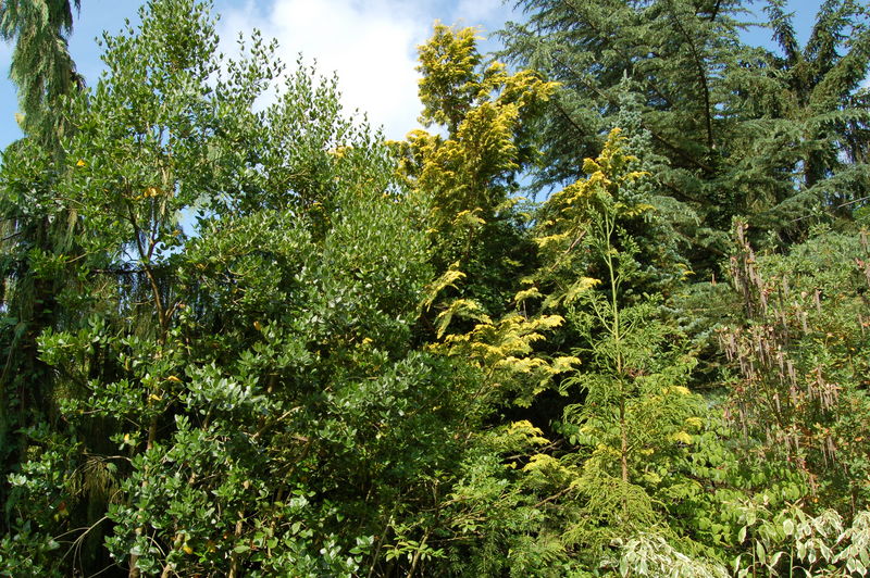 /*Phillyrea latifolia*/, vor vielen Jahren gepflanzt, neben Chamaecyparis optusa cripsii und Cedrus deodara
