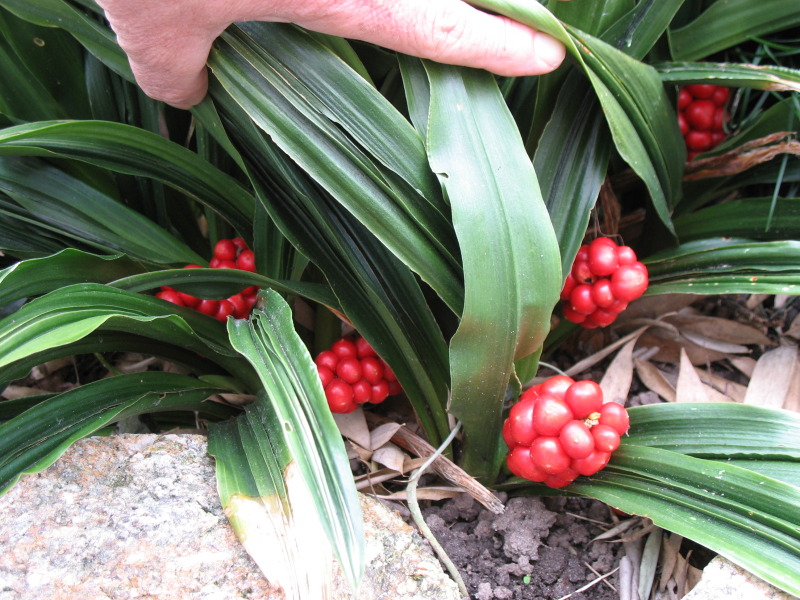 Früchtchen, Früchtchen! Man muss nur etwas unter die Blätter schaun bei /*Rohdea japonica 'Nobori Ryu'*/