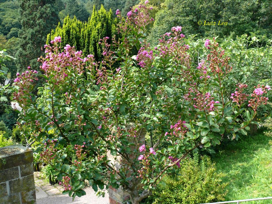 Fast in Vollblüte stehende 'Lagerstroemia indica'.