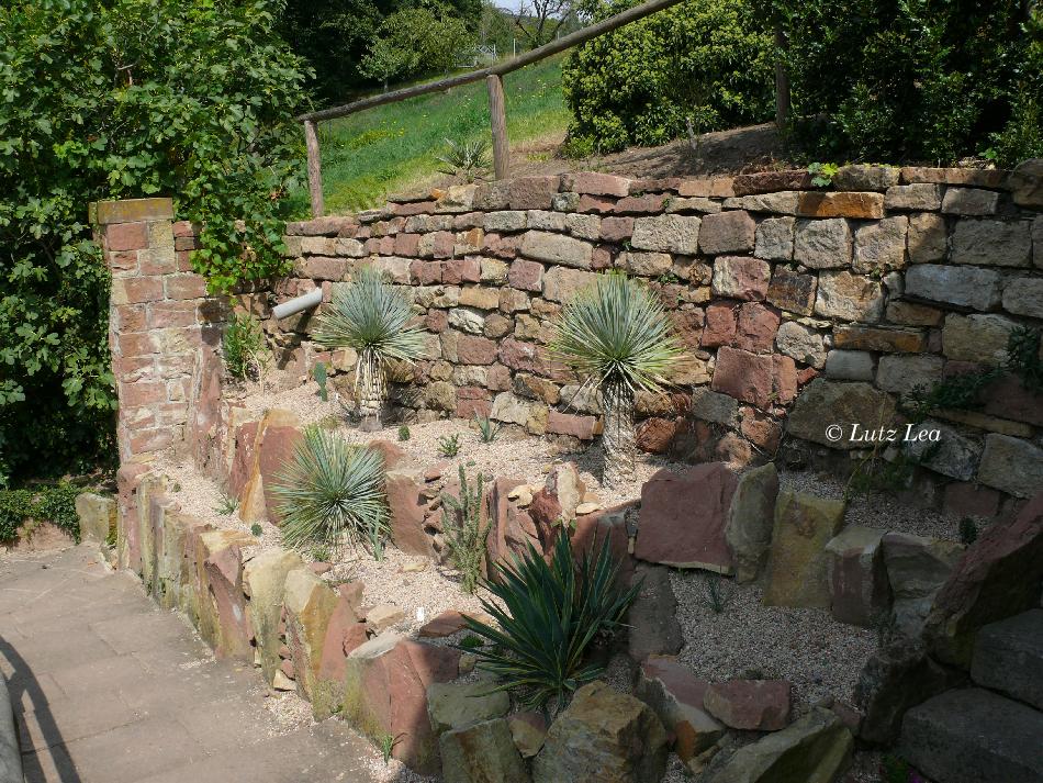 Yuccas und Kakteen auf diesem Beet in idealer Sonnenlage.