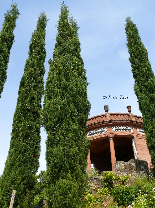 Schlanke Mittelmeer-Zypressen vor dem Sonnentempel.
